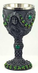 Evitez aussi autant que possible les coupes portant des symboles religieux qui pourraient entrer en conflit symbolique avec la pratique sorcière. Pour les puristes vous pouvez prendre une coupe en argent (ou en alliage à argent majoritaire) gravée avec des runes et des symboles païens. La coupe sert à boire les préparations ou les macérations de plantes, à offrir des liquides lors d’une évocation, à contenir l’eau salée des exorcismes, ou les boissons des libations rituelles.