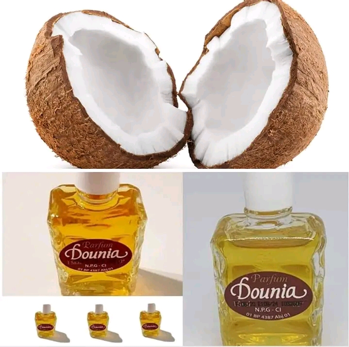 Casser les noix de coco et récupérer l’eau dans la bouteille , verser tout le contenu du parfum Dounia également dans la bouteille et enfin ajoute quelques gouttes de miel