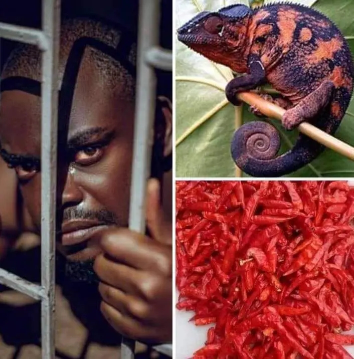 Pour finir, enfoncer la gousse attachée dans la bouche du caméléon, attacher puis enterrer au bord d’une cour d’eau.INCANTATION